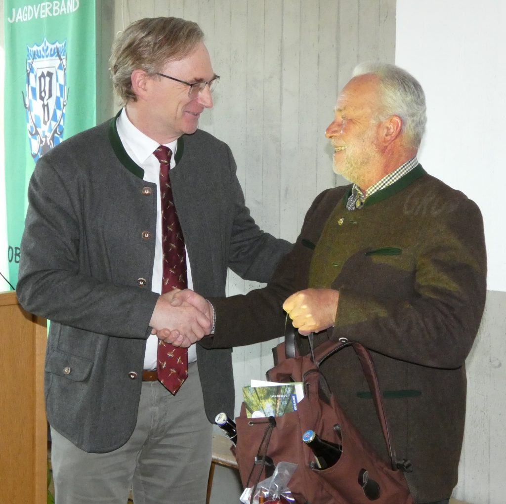 Kreisgruppenvorsitzender Alexander Flierl ließ es sich nicht nehmen sich im Anschluss beim scheidenden Leiter des AELF, Hr. FD Alwin Kleber herzlich für die konstruktive und stets wohlwollend-kritische Zusammenarbeit der vergangenen Jahre zu bedanken. Der übergebene Rucksack für den Ansitz mit schmackhaften Dingen, aber auch einer guten Lektüre (B und B = Buch und Brotzeit) kam sichtlich gut an:
